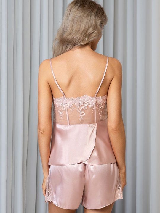 Пудра XL, XXL, XXXL Комплект Mia-Amore состоит из топа и шорт, выполнен из однотонного смесового шёлка. Вырез спинки топа и шорты по низу украшены вставками из вышивного кружева. Спинка топа выполнена в виде декоративного наложения двух деталей. 70% натуральный шёлк, 25% полиэстер, 5% эластан