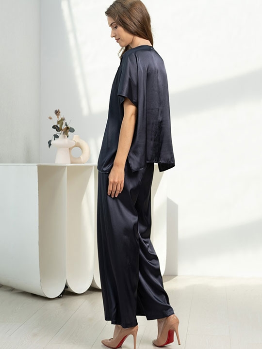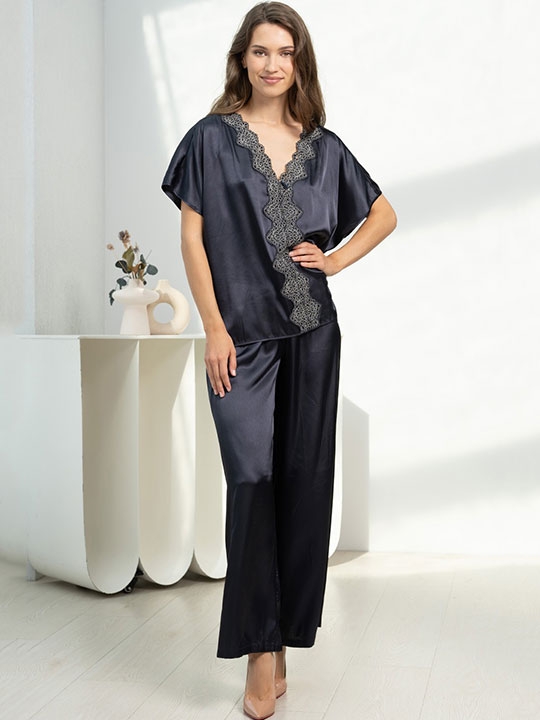 Черника S, L, XXL, XXXL, XXXXL, XXXXXL Комплект Mia-Amore состоит из топа свободного силуэта с коротким рукавом и широких брюк-палаццо. Изделия комплекта выполнены из однотонного смесового шелка. Вышивное двухцветное кружево украшает центральную часть топа. 70% натуральный шёлк, 25% полиэстер, 5% эластан