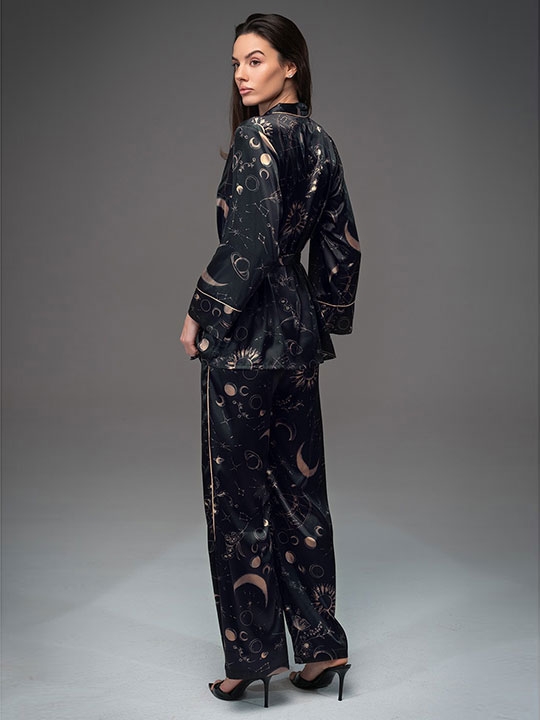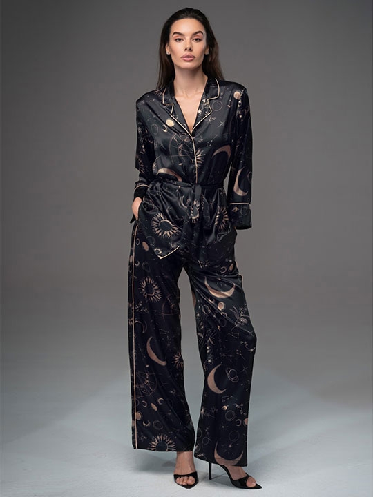 Черный S, L, XL, XXL, XXXL, XXXXL, XXXXXL Комплект жакет с брюками Mia-Amore выполнен из принтованного смесового шёлка. Жакет с центральной застежкой на пуговицы и длинными рукавами, манжеты рукавов декорированы кантом. Кантом оформлен воротник и борт жакета. Жакет дополняет широкий съёмный пояс. Широкие принтованные брюки с контрастными кантами в боковых швах, с поясом на резинке и боковыми кармашками. 70% натуральный шёлк, 25% полиэстер, 5% эластан