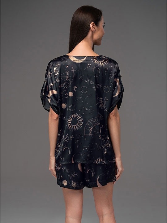 Черный XL, XXXXL Комплект блузка с шортами Mia-Amore выполнен из смесового шёлка. Блузка со спущенными комфортными плечами и центральной застежкой на золотистые пуговки, по бокам блузки разрезы. Свободные по силуэту шорты с поясом на резинке и боковыми кармашками. 70% натуральный шёлк, 25% полиэстер, 5% эластан