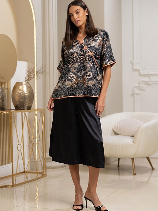 Мультицвет S, M Оригинальный комплект Mia-Amore в китайском стиле состоит из блузки со спущенными плечами и укороченных широких брюк. Блузка из принтованного шёлка, вырез горловины декорирован имитацией застежки на плетёные пуговки в китайском стиле. Укороченные брюки-юбка выполнены из чёрного атласа. Брюки с поясом на резинке и боковыми кармашками. 70% натуральный шёлк, 25% полиэстер, 5% эластан