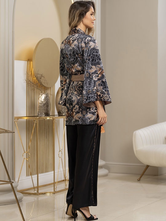 Мультицвет S, XXL, XXXL, XXXXL, XXXXXL Комплект жакет с брюками Mia-Amore выполнен из принтованного смесового шёлка и однотонного атласа. Запашной жакет свободного кроя с длинными рукавами из принтованного смесового шелка, декорированными принтом-компаньоном и золотистым кантом. Жакет запахивается на широкий пояс из ткани-компаньона с золотыми декоративными кисточками. Широкие чёрные брюки с поясом на резинке и боковыми кармашками и принтованным тонким кантом в боковых швах. 70% натуральный шёлк, 25% полиэстер, 5% эластан