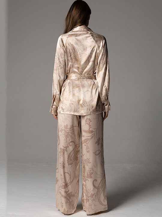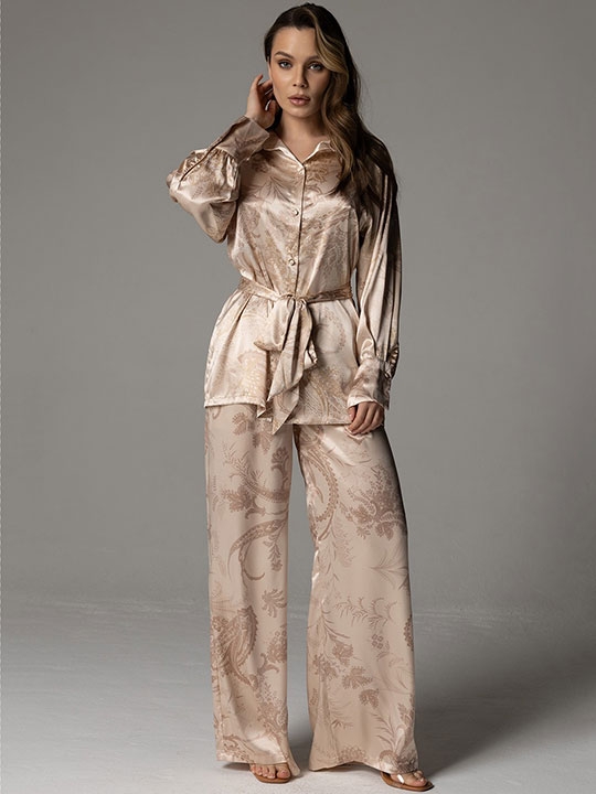 Черника S, M, L, XL, XXL, XXXL, XXXXL, XXXXXL Комплект Mia-Amore состоит из удлинённой рубашки с застёжкой на пуговицы и рубашечным воротником, длинными рукавами на манжетах по низу и брюк-палаццо. Комплект выполнен из принтованного смесового шёлка с изображением пейсли. Брюки с эластичным поясом и с боковыми карманами. По талии на рубашке съёмный пояс, по бокам рубашки разрезы. 70% натуральный шёлк, 25% полиэстер, 5% эластан
