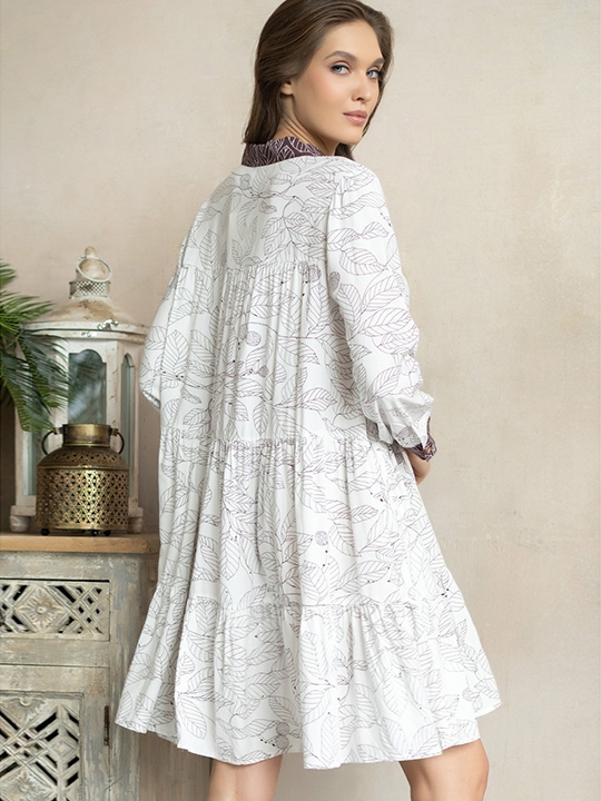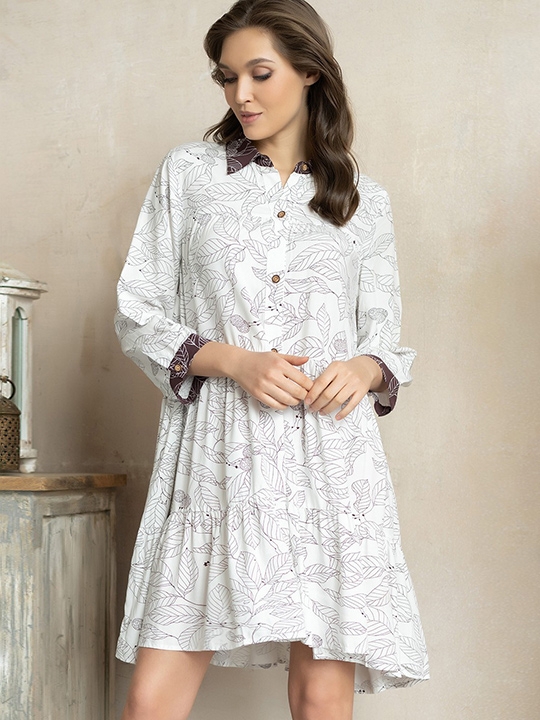 Шоколадный_латте M Рубашка Mia-Amore с центральной застежкой на пуговицы, с рукавами длиной 3/4 выполнена из светлой принтованной вискозы. Эта свободная ярусная модель в стиле бохо уже стала фаворитом многих наших коллекций. Летящий силуэт украсит любую фигуру. Манжеты и воротник выполнены из тёмного компаньона. 100% вискоза