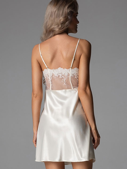 Пудра XXL, XXXL, XXXXL, XXXXXL Короткая сорочка Mia-Amore полуприлегающего силуэта на тонких бретелях без подреза под грудью, выполнена из однотонного смесового шелка, по вырезу спинки сорочка декорирована вышивным кружевом. 70% натуральный шёлк, 25% полиэстер, 5% эластан