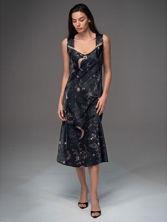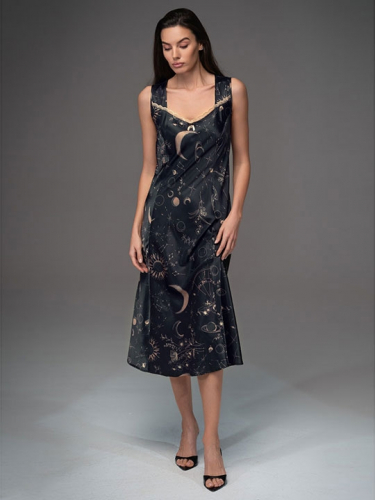 Черный L, XL, XXL, XXXL, XXXXL, XXXXXL Длинная сорочка Mia-Amore на широких бретелях выполнена из принтованного смесового шёлка. Силуэт сорочки, расклешённый к низу, формируется за счёт вертикальных рельефов. Вырез лифа сорочки декорирован тонким золотым кружевом и декоративным бантиком, сбоку сорочки разрез. 70% натуральный шёлк, 25% полиэстер, 5% эластан