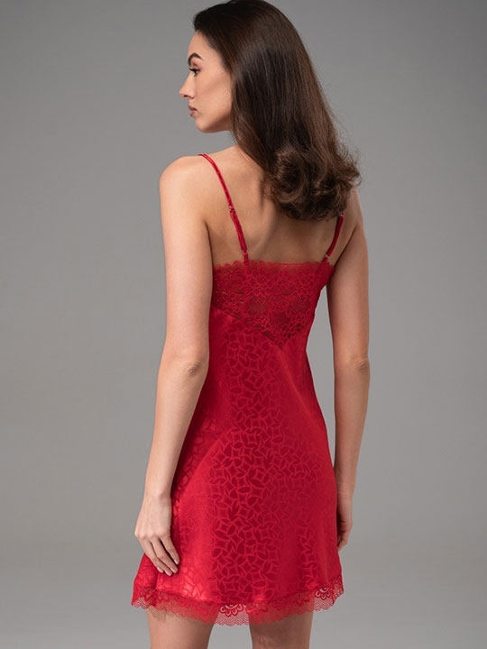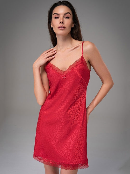 Красный S, M, L, XL, XXL Короткая сорочка Mia-Amore на тонких бретелях без подреза под грудью, выполнена из однотонного искусственного шелка на жаккардовой основе. Ажурное кружево расположено верху и низу сорочки. По центру выреза сорочки - атласный бантик с кристаллом Swarovski. 100% полиэстер