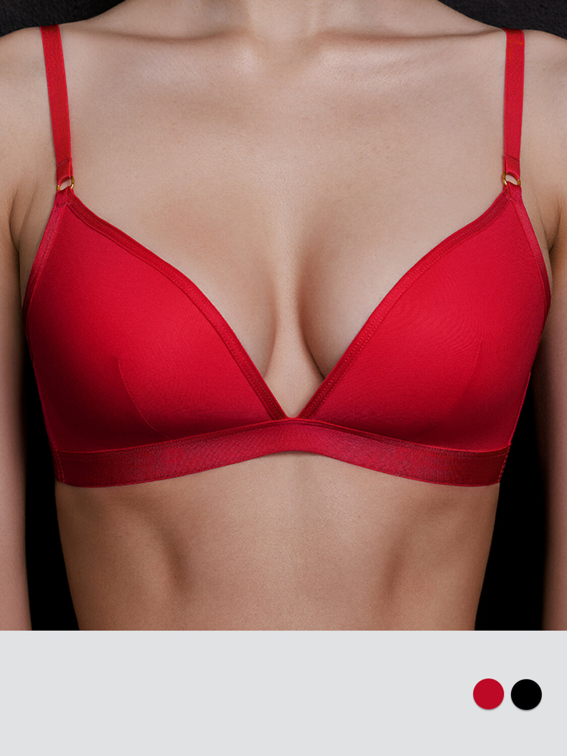 Бюстгальтер «триангл» из эластичной сетки с уплотненными формованными чашками без косточек. С акцентными лентами по краям. Эффектно подчеркивает декольте, превосходно облегает и обеспечивает комфортную поддержку благодаря регулируемым бретелям и удобной застежке на два крючка.