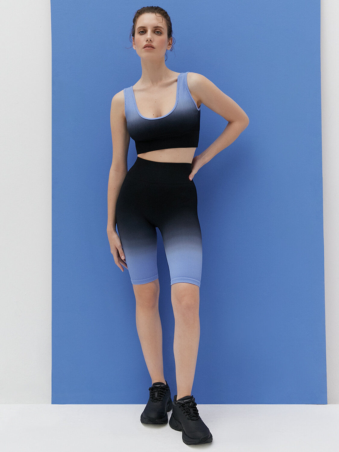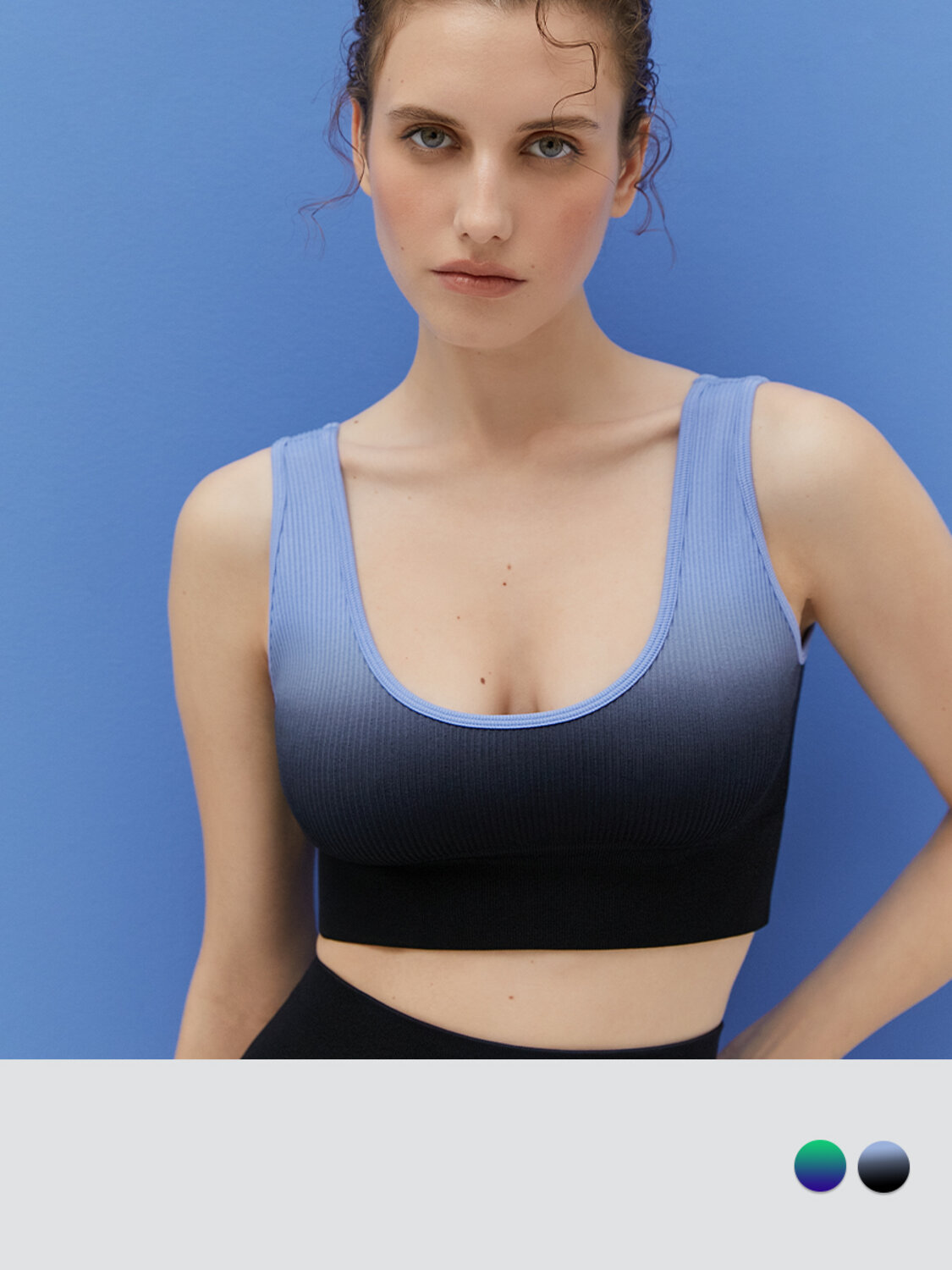 Благодаря эффектному дизайну с плавным переходом из одного цвета в другой топ привлекает внимание и создает стильный акцент в образе. Превосходно подойдет как для активных тренировок, так и для создания повседневных образов.