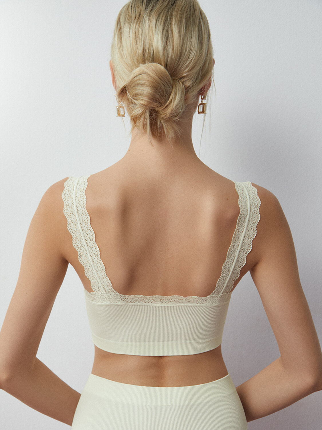 Комфортный топ в рубчик на широких кружевных бретелях со съемными формованными вкладышами. Верх лифа обработан ажурным кружевом с изящным цветочным рисунком.