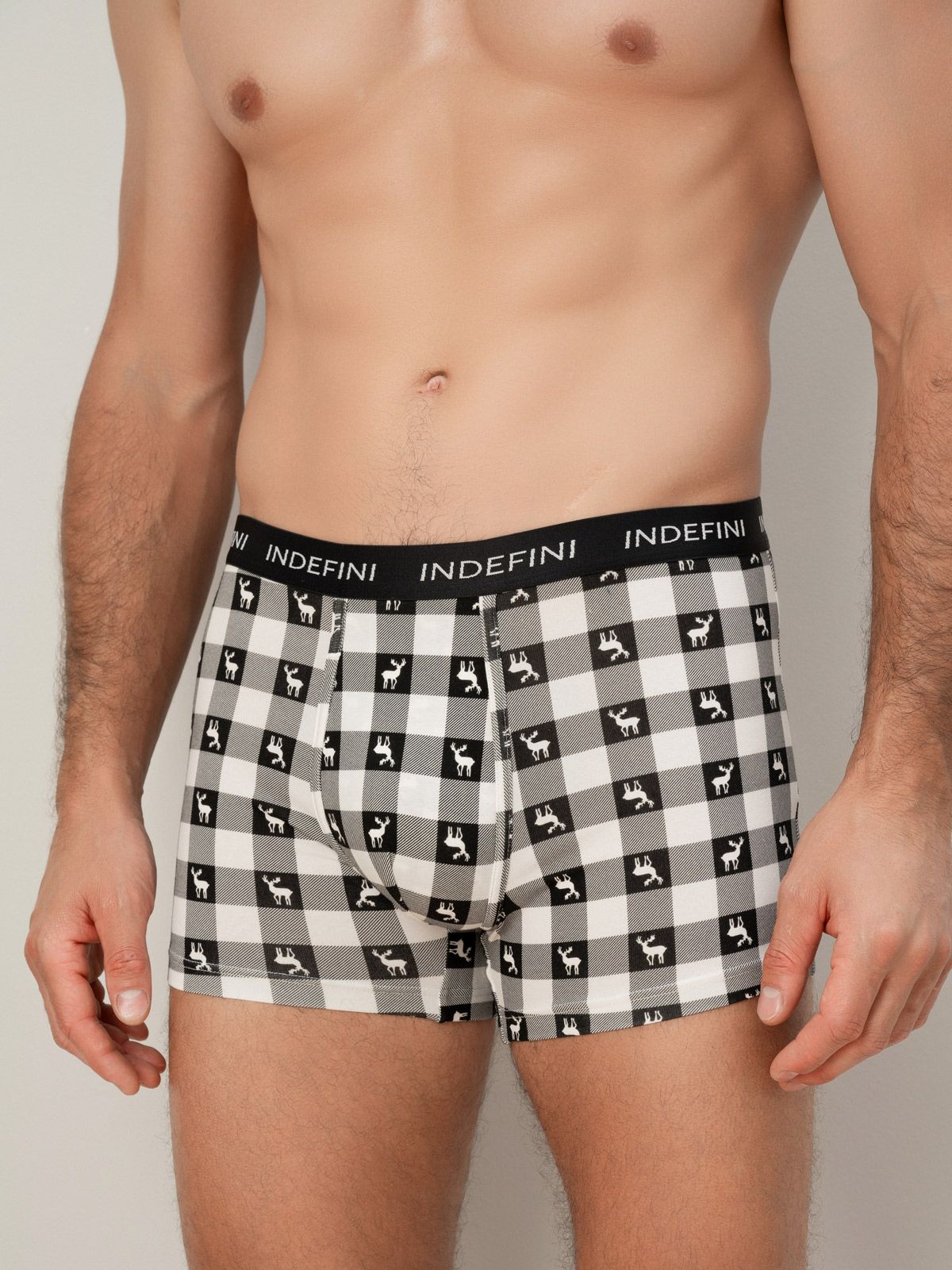 Трусы украшены принтом в черно-белую клетку с изображениями оленей.