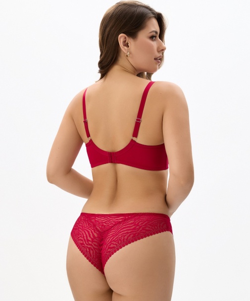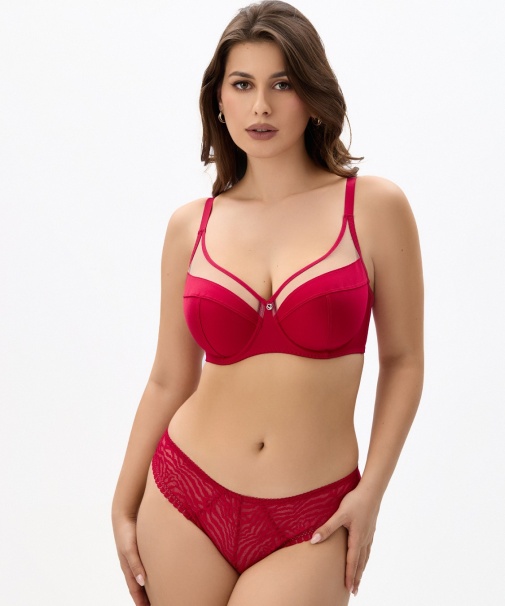 Бюстгальтер с мягкой чашкой, на каркасах, из трикотажного полотна. Чашки Т- образного членения из неэластичного трикотажного полотна, верхняя деталь декорирована сеткой. Упругие пластины в боковых деталях стана.