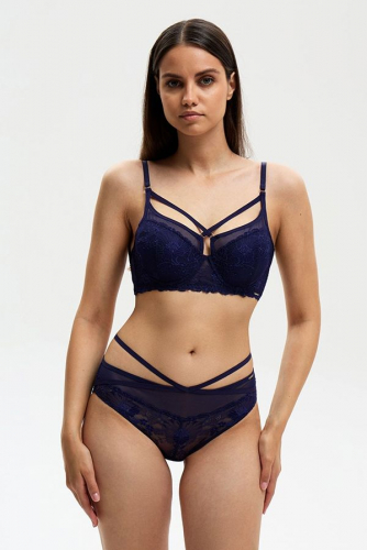 Бюстгальтер с формованными чашками balconette с push-up во всех размерах, на каркасах и с боковыми корсетными вставками выполнен из нежного кружева и сетки глубокого синего цвета. Переднюю часть лифа украшают стрепы, переходящие в регулируемые бретели. Застежка на 2 крючка и 3 ряда петель. Дополнительные украшения - брендированный шильдик и кольца на стрепах. Ширина бретелей на объемы 70, 75 и 80 см с чашками А,В,С - 10мм, на объемы 75, 80 и 85 с чашками D и E и размер 85С - 12 мм.