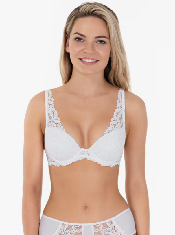 Бюстгальтер “пуш-ап” на каркасах и стане. В основе чашки конструкция из трёх деталей. Чашки на дубляже с хлопком, с вкладышами. Верхняя деталь чашки из эластичного полотна. На чашки наложены детали из эластичного кружева в форме вытянутого треугольника, образовывая красивое V-образное декольте. Передняя часть сана из кружева, боковые детали стана из эластичного полотна. Бюстгальтер дополнен бантиком.