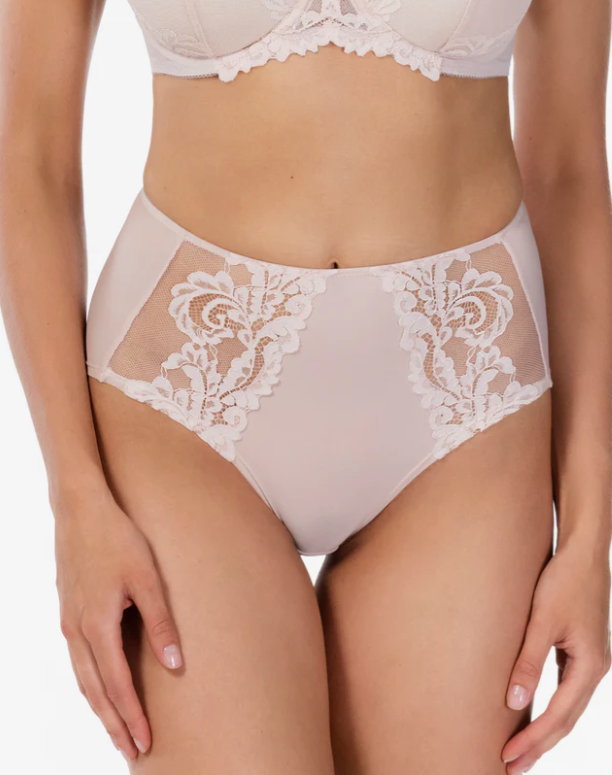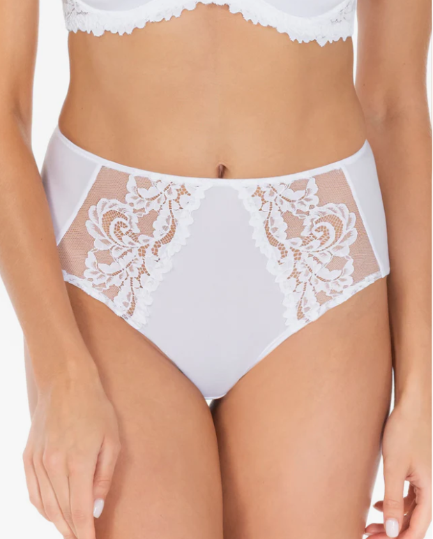 Трусы с высокой линией талии из эластичного полотна. Спереди в боковой части детали из эластичного кружева. Нижние срезы обработаны плоским швом без отделочных лент.