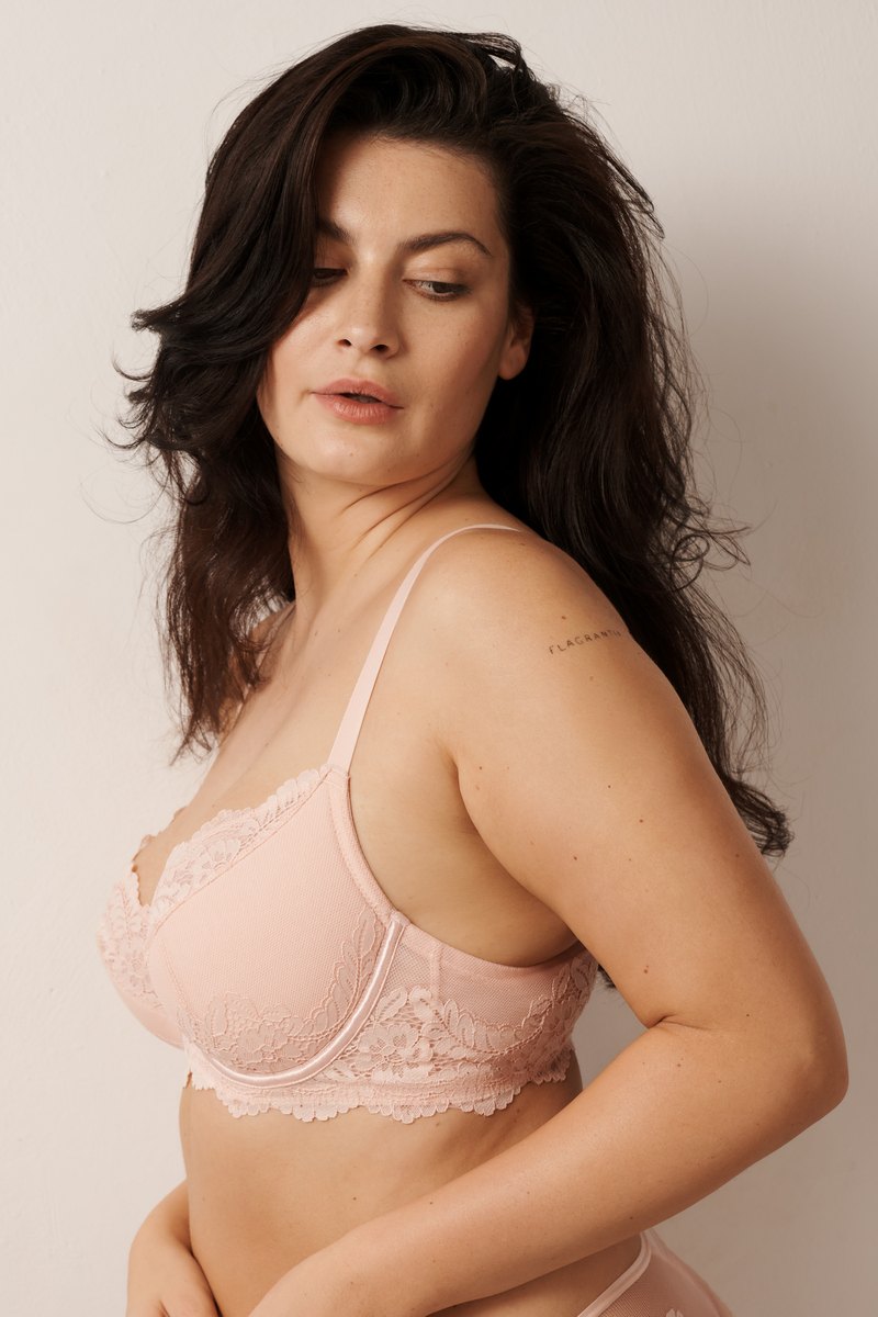 Кружевной бюстгальтер с полупоролоновой чашкой на кости и съемными вкладышами пуш-ап. Регулируемые бретели. Трехступенчатая застежка на крючки. Кружево: 90% полиамид, 10% эластан Микротюль: 75% полиамид, 25% эластан Сетка: 84% полиамид, 16% эластан Подклад чашки: 100% хлопок