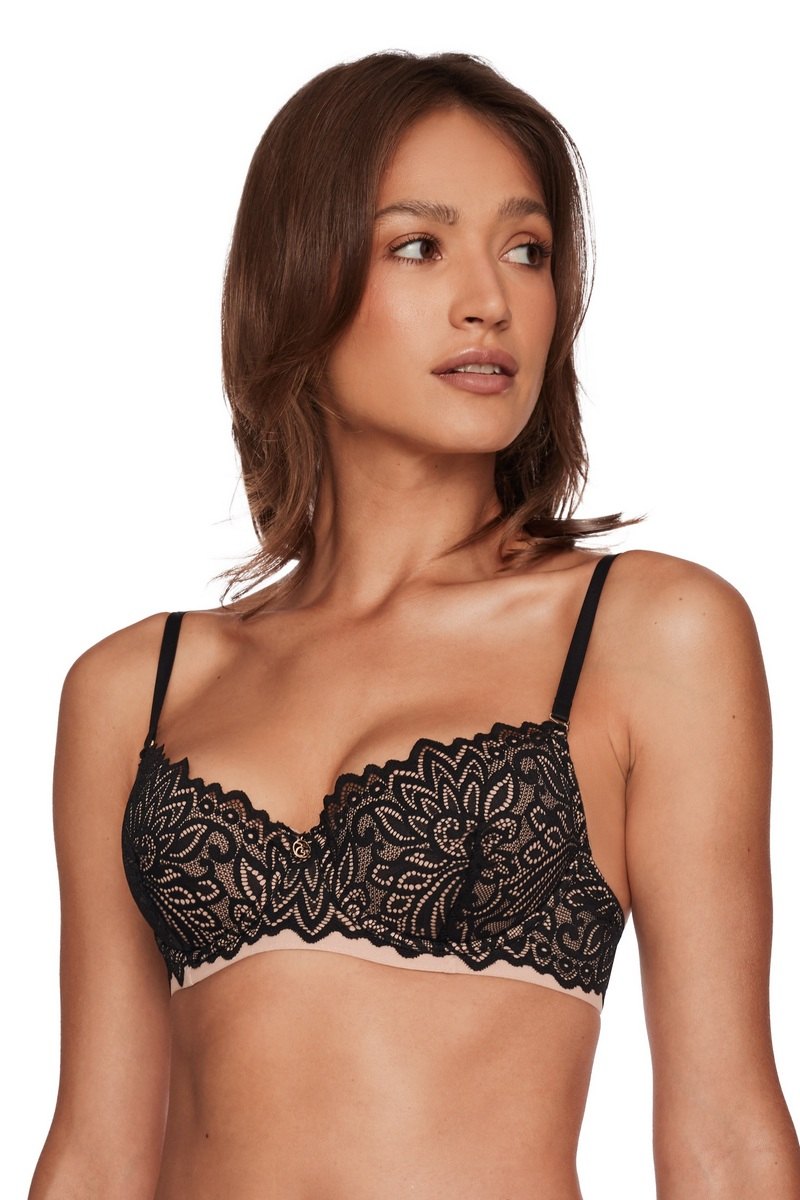 Кружевной бюстгальтер со съемным пуш-ап на кости. Трехступенчатая застежка. Съемные регулируемые бретели. Подклад чашек выполнен из хлопка. Кружево: 86% полиамид, 14% эластан Сетка: 95% полиамид, 5% эластан Подклад чашки: 100% хлопок