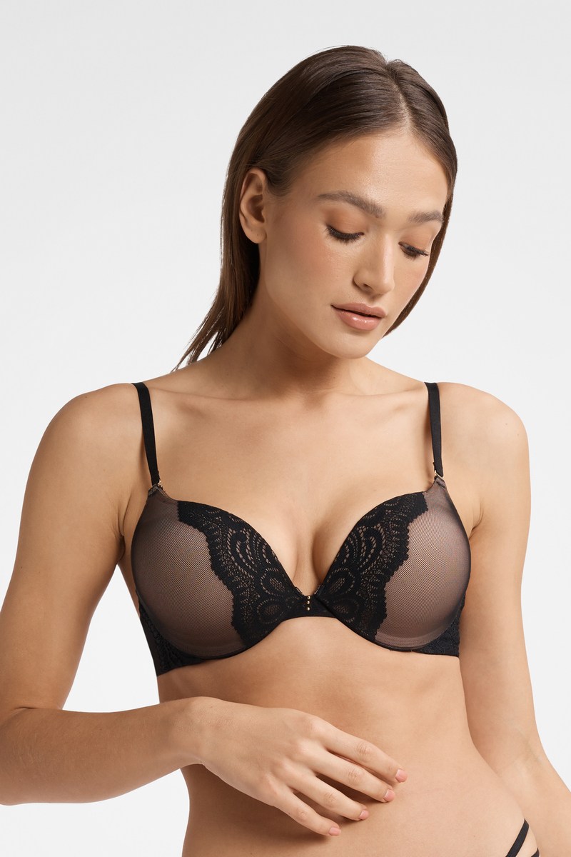 Бюстгальтер KENDRA от европейского производителя Esotiq. Бюстгальтер с чашкой супер пуш-ап на кости. Выполнен из микротюли и дополнен кружевом. Трехступенчатая застежка на спине. Съемные регулируемые бретели. Кружево: 88% полиамид, 12% эластан Бретели: 94% полиамид, 6% эластан Сетка: 94% полиамид, 6% эластан Подклад чашек: 100% полиэстер