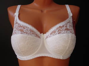 Бюстгальтер полупоролон с мягкой чашечкой и диагональным швом, нижняя деталь с Т-образным швом, на каркасах. Бюстгальтер на тонкой поролоновой основе в нижней части чашечки, весь обтянут эластичным кружевным полотном. Спинка, стан и бочка выполнены из эластичного полотна. Высота бочка 8 - 10см. Регулятор длины бретели сзади. Застежка на два крючка, два варианта объема. Между чашечками на стане украшен маленьким бантиком.