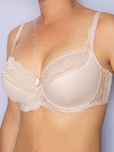 Бюстгальтер "мягкая чашка" с подкроем.Выполнен из набивной микрофибры в точку и эластичного кружева. Нижние детали чашки на дубляже с хлопком. Благодаря боковому подкрою, переходящему в бретель обеспечена высокая функциональность бюстгальтера и гарантирована непревзойденная посадка. На стане бюстгальтера боковые корректирующие пластины, позволяющие прилегать к телу и не скручиваться поясу бюстгальтера, создают необходимую опору и делают силуэт более четким. Украшение: атласный бантик.
