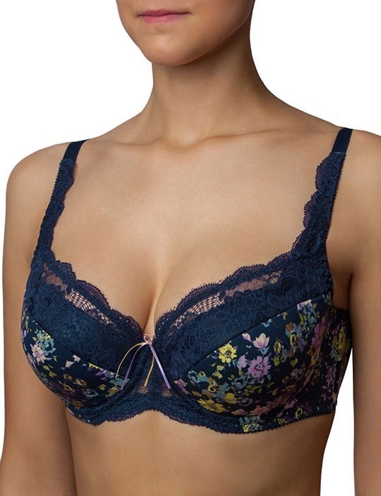 Бюстгальтер на поролоне. Выполнен эластичного кружева и принтованного полотна. Нижние детали чашки на дубляже с хлопком. Идеально приподнимает и поддерживает грудь, создавая красивую зону декольте. На стане бюстгальтера боковые корректирующие пластины, позволяющие прилегать к телу и не скручиваться поясу бюстгальтера, создают необходимую опору и делают силуэт более четким. Украшение: атласный двухцветный бантик. Синий