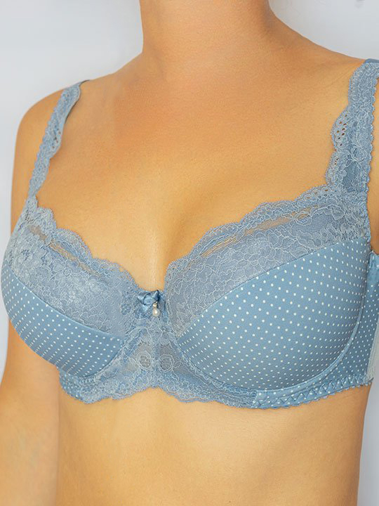 Бюстгальтер на поролоне. Выполнен из эластичного принтованного полотна в горошек и эластичного кружева. Нижние детали чашки на дубляже с хлопком. Идеально приподнимает и поддерживает грудь, создавая красивую зону декольте. На стане бюстгальтера боковые корректирующие пластины, позволяющие прилегать к телу и не скручиваться поясу бюстгальтера, создают необходимую опору и делают силуэт более четким. Украшение: атласный бантик.