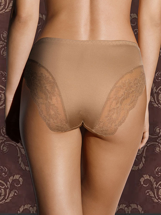 Трусы-слип комфорт с завышенной линией талии. Выполнены из эластичной принтованной микрофибры, гладкой микрофибры и эластичного кружева. Срезы по краю ножек обработаны на плоскошовной машине. Украшение: атласный бантик.