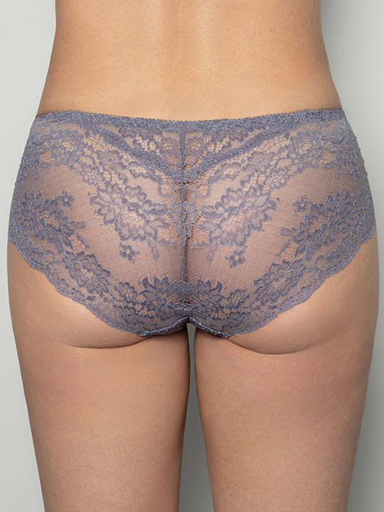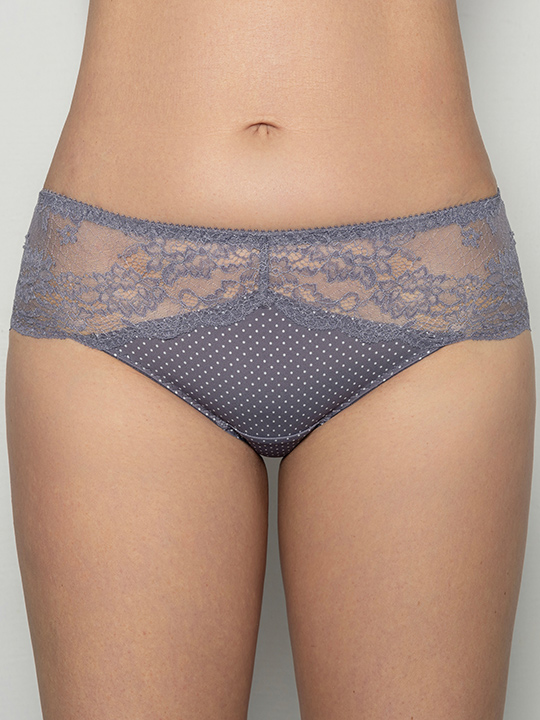 Трусы-слип (панти) с заниженной линией талии. Выполнены из эластичной принтованной микрофибры в горошек и эластичного кружева. Срезы по краю ножек обработаны на плоскошовной машине.