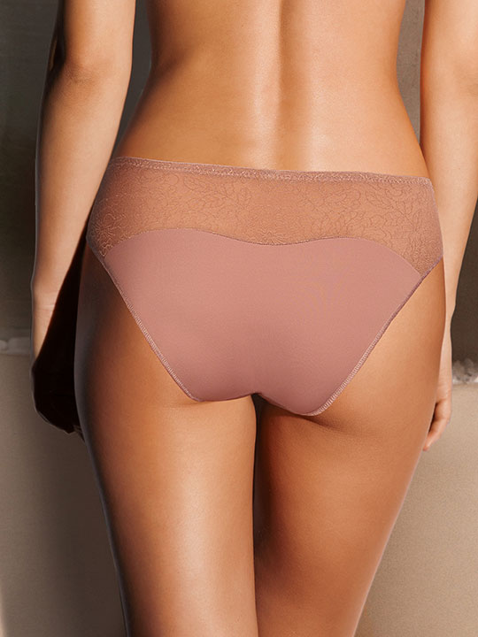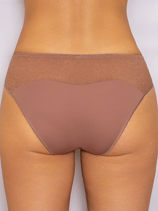 Трусы-слип комфорт со средней линией талии. Выполнены из ультратонкого, полупрозрачного эластичного кружевного полотна нового поколения и эластичной микрофибры. Срезы по краю ножек обработаны на плоскошовной машине.