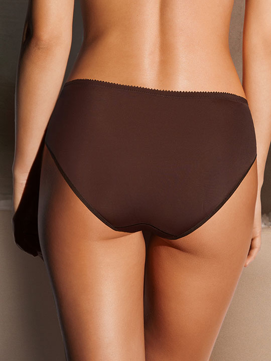 Трусы-слип со средней линией талии. Выполнены из вышивки на неэластичной сетке, микрофибры. Срезы по краю ножек обработаны на плоскошовной машине.