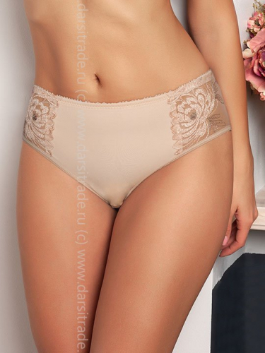 Трусы-слип со средней линией талии. Выполнены из вышивки на неэластичной сетке, микрофибры. Срезы по краю ножек обработаны на плоскошовной машине.