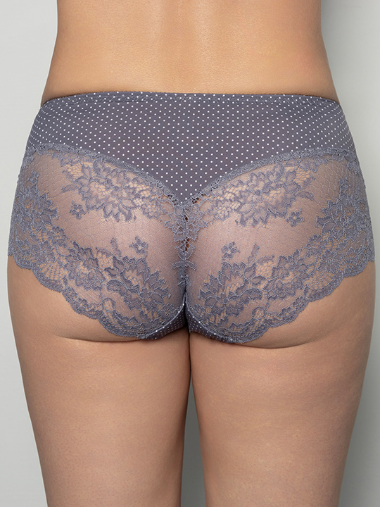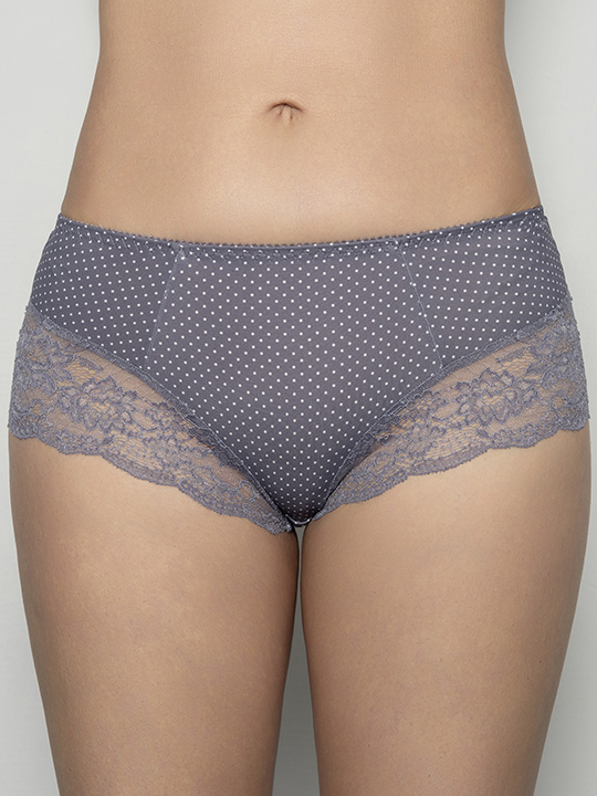 Трусы-слип комфорт с завышенной линией талии. Выполнены из эластичной принтованной микрофибры в горошек и эластичного кружева.
