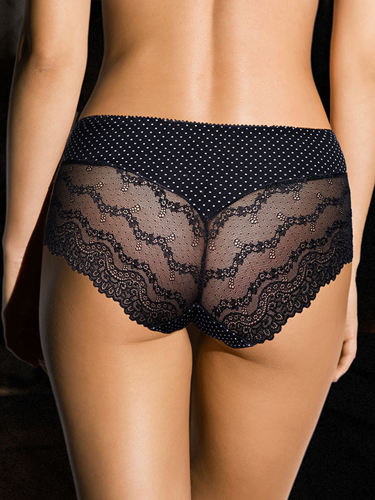 Трусы-слип комфорт с завышенной линией талии. Выполнены из эластичной принтованной микрофибры в горошек и эластичного кружева.