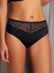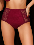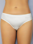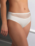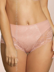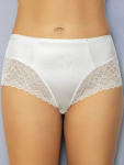 Трусы-слип комфорт макси с завышенной линией талии. Выполнены из набивной микрофибры в точку, гладкой микрофибры, эластичного кружева и сетки. Срезы по краю ножек обработаны на плоскошовной машине. Украшение: атласный бантик.