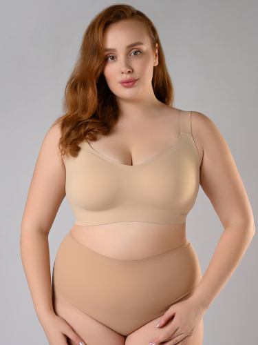 Бюстгальтер-топ из мягкого и прочного полиамида. Имеет слитные несъемные чашки — они мягко поддерживают грудь, придают комфортную фиксацию без косточек. Бесшовный бюстгальтер ощущается как «вторая кожа» и незаметен под одеждой. Широкие бретели равномерно распределяют нагрузку на плечи, застежка сзади позволяют отрегулировать посадку, а рельефные линии по бокам усиливают поддержку.