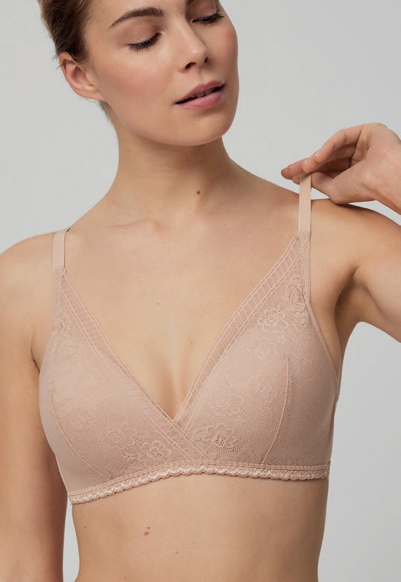 Бюстгальтер без косточек с подкладкой, украшен тонким кружевом.