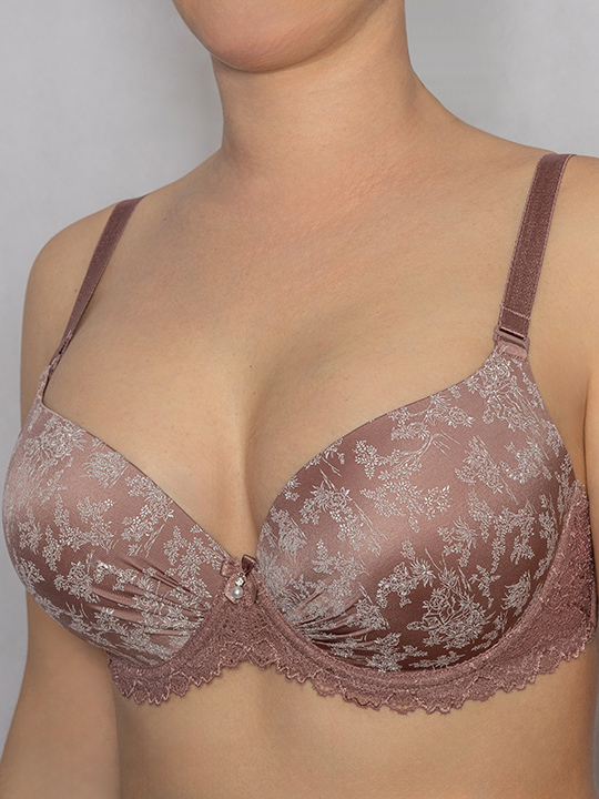 Бюстгальтер "пуш-ап" с формованными чашками с гелевыми подушками. Выполнен из эластичного принтованного полотна и эластичного кружева. Визуально увеличивает грудь, формирует шикарную линию декольте. Украшение: атласный бантик подвеской. Кофейно-розовый