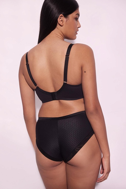 Черный бюстгальтер на подкладке, обтянутый тонкой трикотажной тканью. Самое главное его преимущество: абсолютно гладкая поверхность ткани. Благодаря тому, что швы имеют мелкие и аккуратные стежки, они просто незаметны даже если носить сильно облегающую одежду.