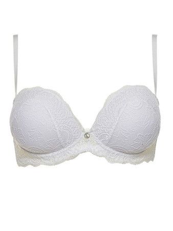 Бюстгальтер "Анжелика"супер пуш-ап с гелем, на косточках. Визуально прибавляет +2 размера. Глубокая линия декольте. Бочок усилен вертикальными, гибкими пластинами для лучшей посадки. Отстегивающиеся, регулируемые бретели. По всему нижнему краю и верхнему краю боковых деталей проложена силиконовая лента для лучшей фиксации на стане для носки без бретелей. Застежка в три ряда на три позиции. Выполнен из эластичного кружева. Коллекция "Formedouble".