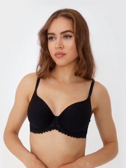 Бюстгальтер с формованными чашками из тонкого эластичного поролона на косточках, кружевной стан, литые регулируемые бретели, атласный бантик в центре. Размер чашки данной модели E (указан в конце артикула). Лайкра: 16% Полиамид: 72% Полиэстер: 12%