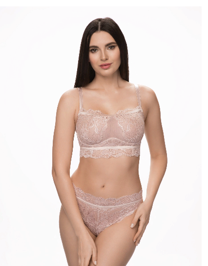 Кружевной бюстгальтер "bralett" с легкими чашками на каркасах, по центру декорирован эластичной сеткой. Благодаря вертикальным выточкам на чашках грудь имеет поддержку снизу. Передняя часть стана укреплена неэластичным трикатажным полотном. По горловине и стану настрочена 12 мм эластичная лента на плоскошовной машине. Выполнен из объемного эластичного кружева с блеском.