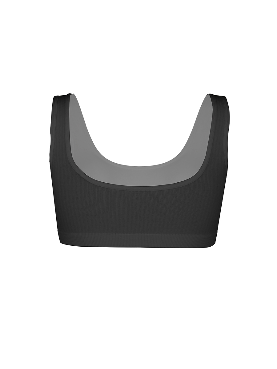 Бюстгальтер-топ из эластичного рибового полотна в широкий вертикальный рубчик с мягким подкладом и съемными вкладышами. Без каркасов и боковых корсетных вставок. Бретели широкие, не регулируемые. Брендированная лента под грудью.