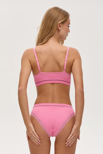 Бюстгальтер формы Soft bra с мягкими чашками, без каркасов и боковых корсетных вставок, выполнен из нежного материала в рубчик. Подклад в передней части и съемные формованные чашки. Эластичное кружево по верхнему срезу и резинка, с вывязанной полоской контрастного цвета, украшают изделие. Однотонные регулируемые бретели не отстегиваются. Без застежки.