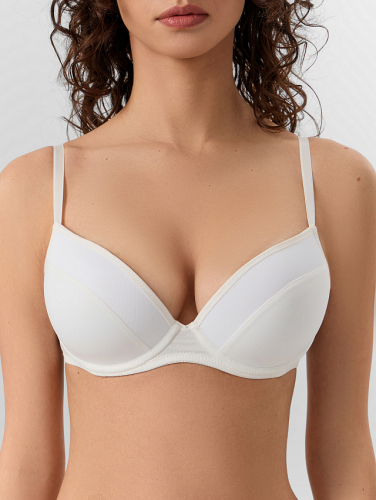 Бюстгальтер женский пушап, на каркасах 63 типа, с формованной чашкой (СС-64.18), без стана. Выполнен из микрофибры с отделкой по чашке кружевом с прямым краем. Чашка обтянута микрофиброй с подформовкой, по верхнему краю деталь из кружева.