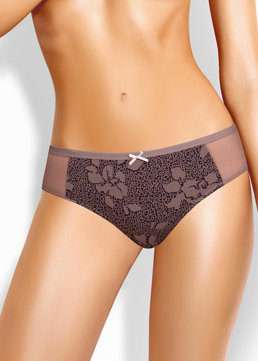 "Описание: Трусы бикини женские из эластичного хлопкового полотна. Обработка краев по талии - окантовочная резинка, по ноге - полуокантовка. По переду боковые вставки из сетки, атласный бант..