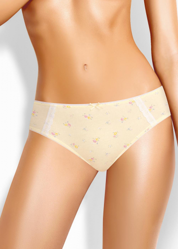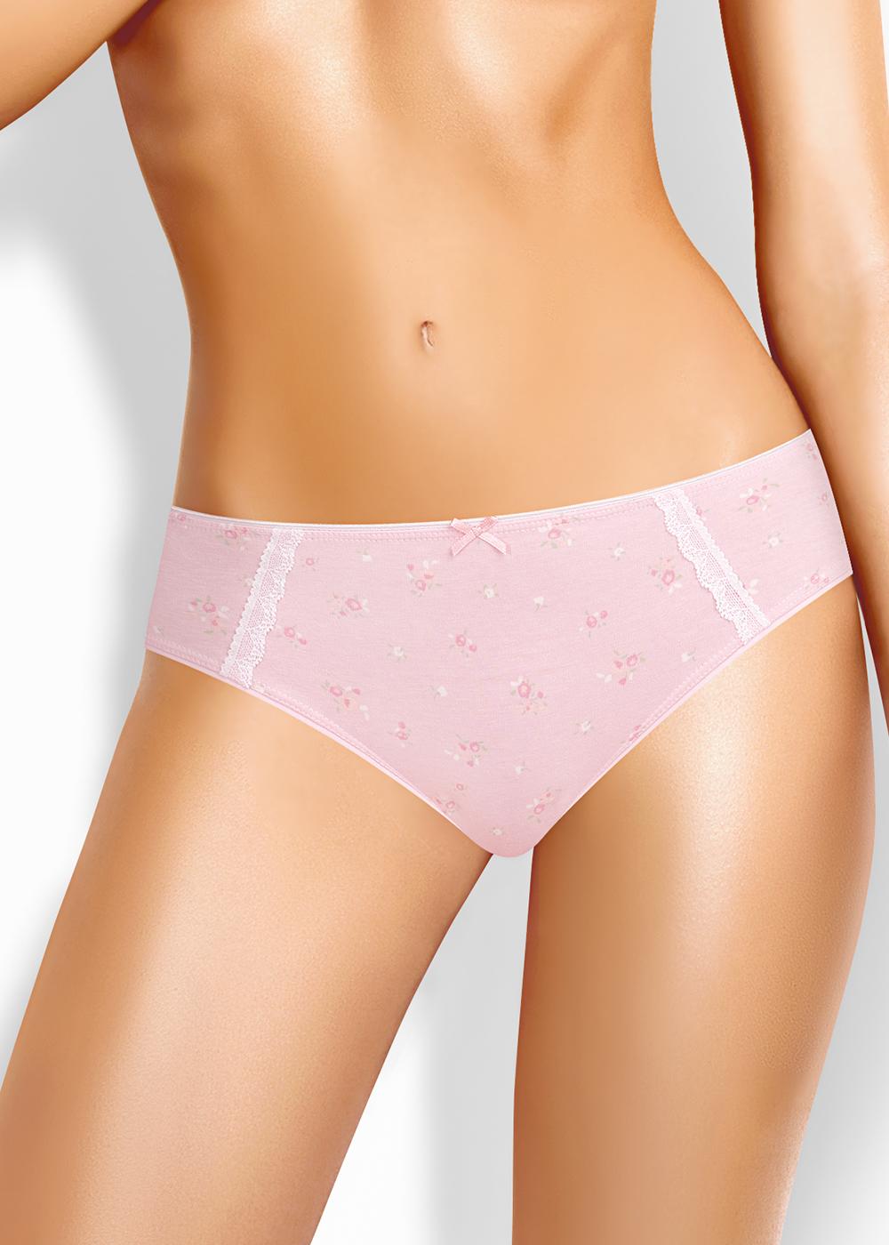"Описание: Трусы бикини женские из эластичного хлопкового полотна. Обработка краев по талии и ноге - резинка с кантом. По переду вставки из узкого кружева, атласный бант.
