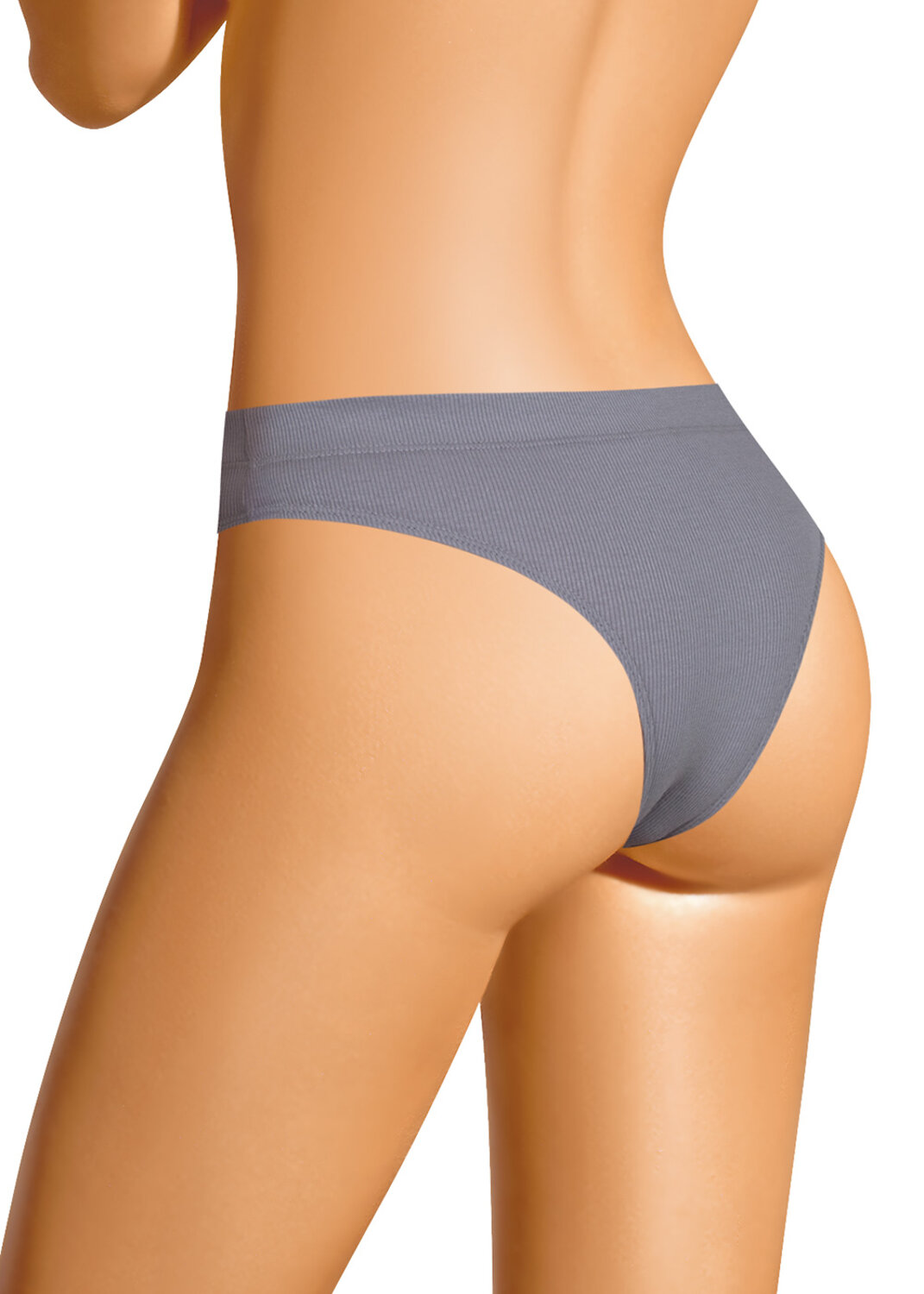 Трусы бразилиана женские из эластичного хлопкового полотна кашкорсе лапша. Обработка краев по талии и ноге - подгибка с внутренней резинкой. Спереди на поясе по центру жаккардовая нашивка. серый