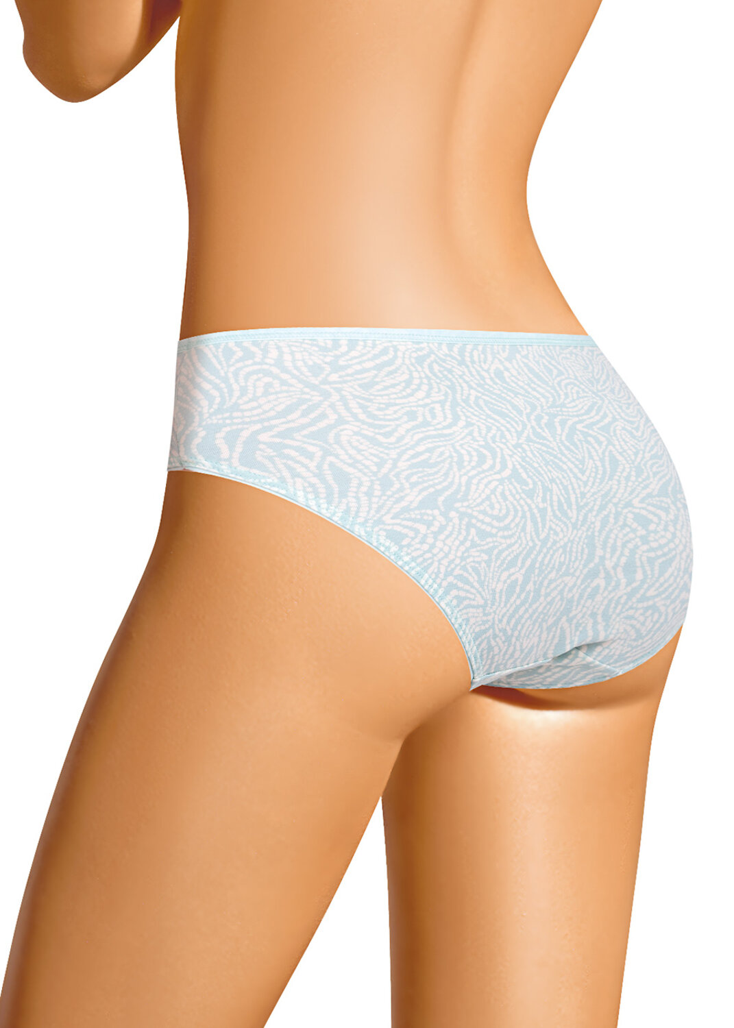 Трусы бикини женские из эластичного хлопкового полотна. Обработка краев по талии - окантовочная резинка с застилом, по ноге - полуокантовка. Спереди принт. св.зелёный/молочный