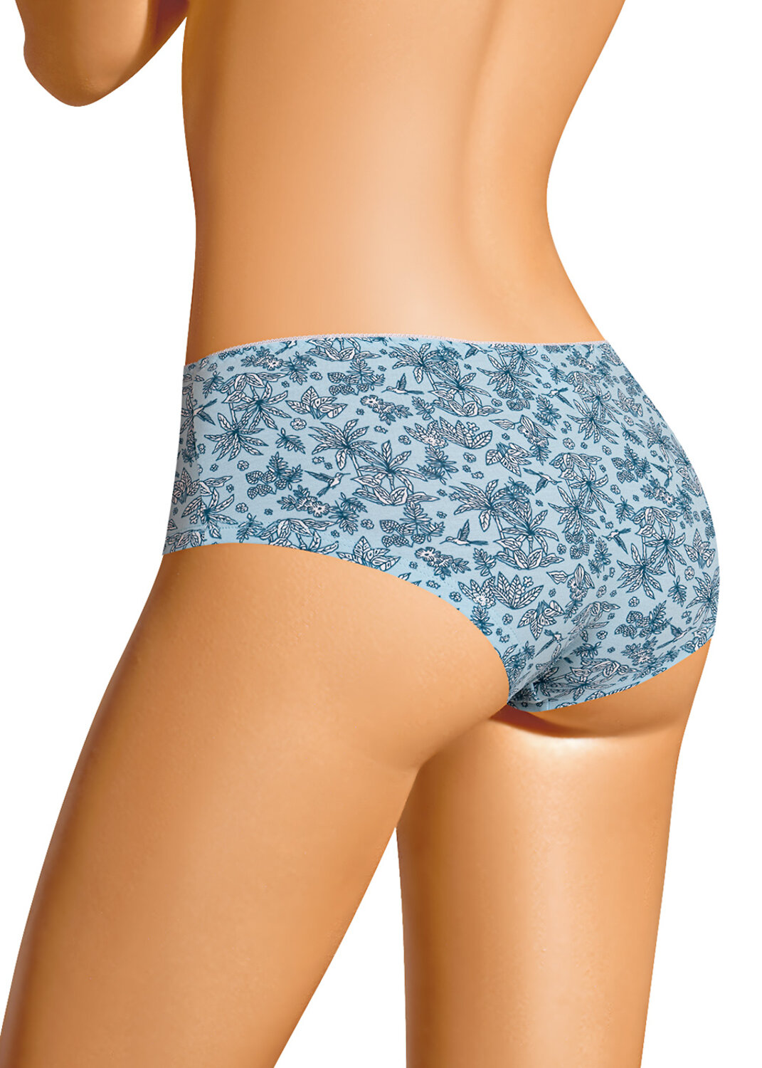 Трусы шорты женские из эластичного хлопкового полотна. Обработка краев по талии - ажурная резинка, по ноге - подгибка. По переду атласный бант. голубой/молочный