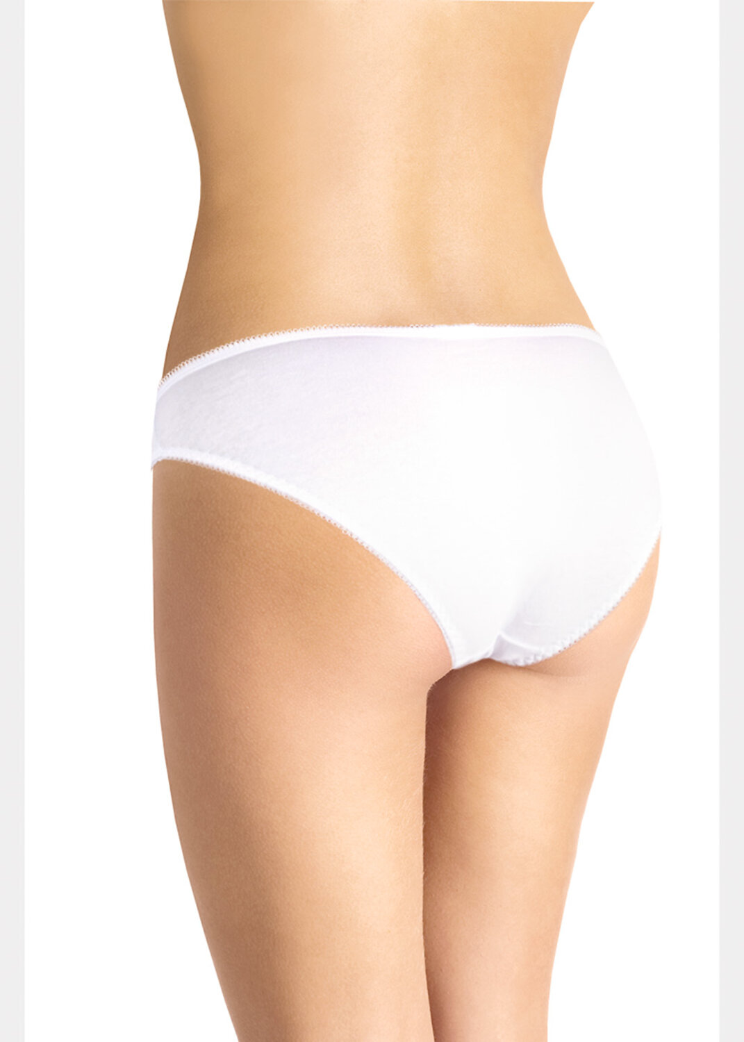 Трусы бикини женские из эластичного хлопкового полотна. Обработка краев - ажурная резинка с фестоном. Спереди бант и вставки из кружева.